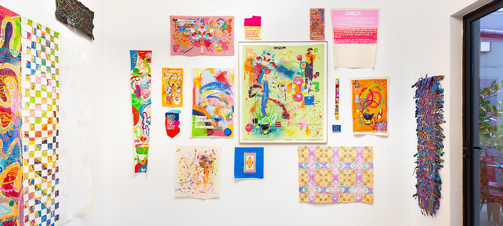 É esse mesmo toque que ela agora transfere ao tecido, emaranhado, porém, na explosão de cores de seu fluxo de pensamento. Na falta de palavras, ela as empresta de autores que lhe dizem de si e que ela entremeia em seus trabalhos: Sandor, Neumann, Jung, entre outros, todos eles retirados do livro Integração Psicofísica - O Trabalho Corporal e a Psicologia de C. G. Jung de Rosa Maria Farah.